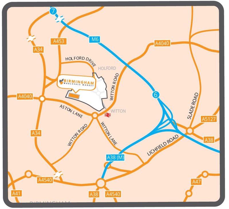 Motorists will drive along A34 Walsall heading towards the A453 Aldridge Road and turn on to Holford Drive. (please note there are substantial road works happening here currently) Finally once on Holford Drive motorists will pick up signs for the Birmingham Wholesale Market.